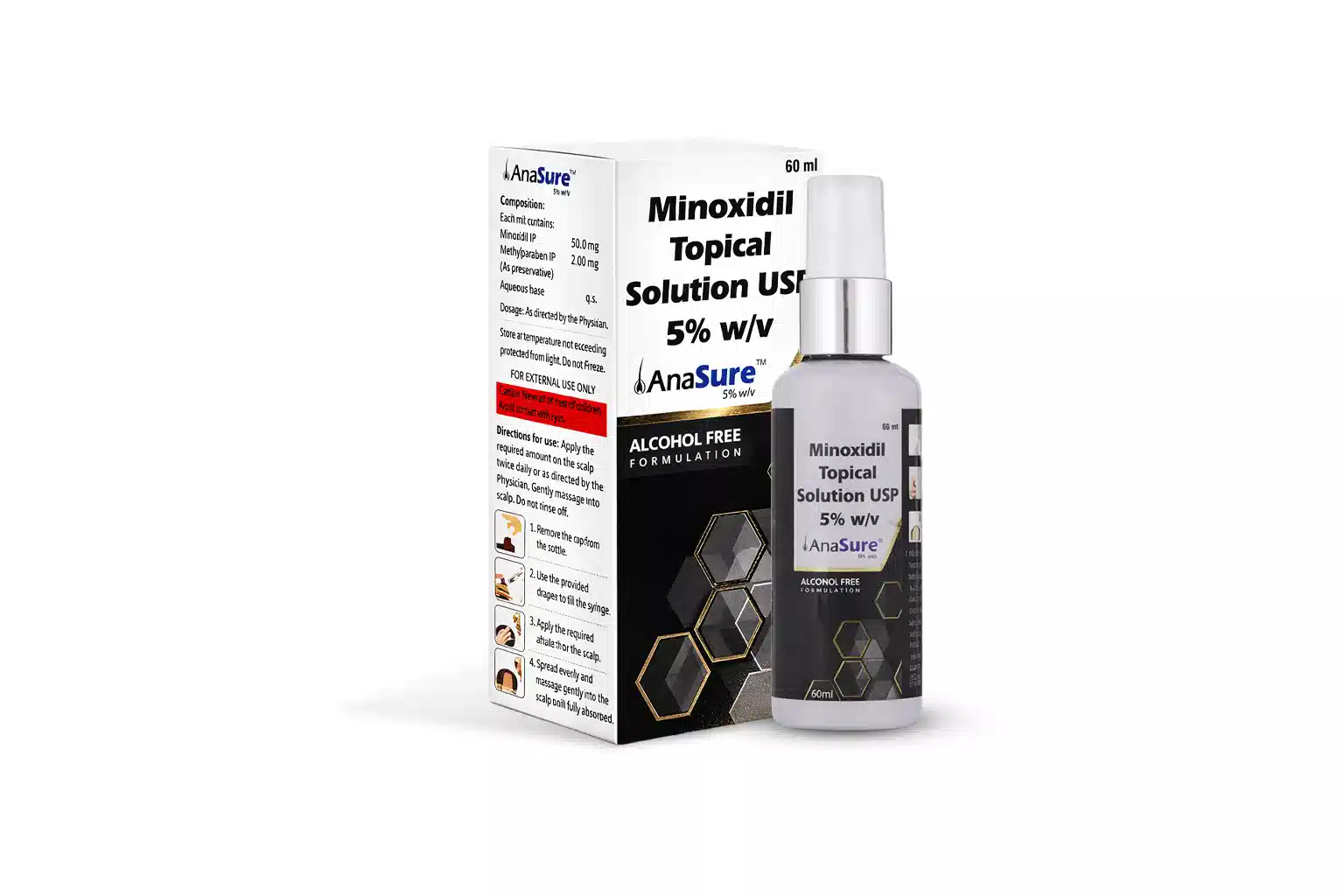 Anasure 5% solution 60 ml is a topical haircare solution that is being used in the condition of hairloss, baldness and to improve hair growth. It works by the vasodilatory action of Minoxidil as it may widens blood vessels to increase the blood flow to hair follicles for hair growth.