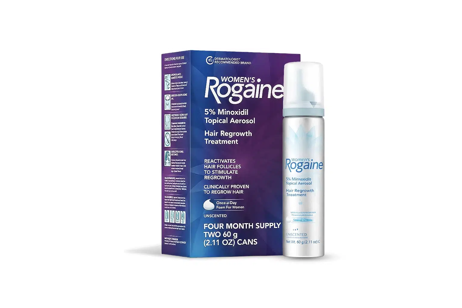 Rogaine Women’s 5% Minoxidil Foam is a proven, once-daily treatment for female pattern hair loss. Easy to apply, less irritating than solution, and effective for many women. Results take 3 to 6 months to appear; continuous use is required to maintain regrowth. Side effects are mostly mild and topical. Stopping the medication will cause the regrown hair to fall out within weeks to months.